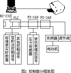 2. 系统控制部分 控制部分的硬件使用的是三菱公司(Mitsubishi)的变频器FR-A540,以及FX2N系列的PLC、2AD模块和2DA模块。 通过变频器使电动机软起动(电动机可从0~5OHz缓慢起动),减少泵因高速起动引起电流对电网的冲击消除泵的喘振现象使流量平稳调节增强系统的稳定性和可靠性。以PLC作为现场控制器。通过DA模块调节变频器的频率在0~5OHz范围内变化,实现电动机的无级调速:通过AD模块采集压力传感器和被校表(即待标定的流量计)的4~2OmA模拟信号,同时系统中实时数据(包括实时标定数据和控制标志信号)通过PLC的I/O节点传送到计算机。