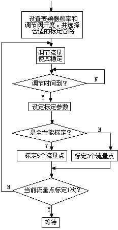 二 工作原理 1. 标准表法 通过在一段标定时间内(应设为标定时间足够大以保证标定精确度),同时采集由被校表和标准表输出的脉冲数,计算出累积流量,从而确定被校表的误差。流量计基本误差为: 式中,Qm— 被校流量计表示的流量值 测试中可选择每个流量点标定3次。每一点的重复性误差E2为: 式中,S— 标准偏差 “标准表法”作为装置的二级基准,可标定精确度等级比标准表低的流量计。 2. 静态容积法 静态容积法就是一种以标准容器为基准的标定方法。由标准容器、换向器、计时器组成。在换向器上装有一对光电管,计算机接收通过光电管的信号以启动和关闭定时器。标定时换向器换向,系统在此同时自动开启计时器,并采集被校表的脉冲数,当达到标准容器的标称容积后,系统将自动切换换向器至旁路,同时停止计时和停止被校表脉冲数,同样可以通过式(1)、(2)计算被校表的基本误差和重复性误差。 静态容积法作为本套标定装置的一级基准。 3. 动态秤重法 动态秤重法是以标准秤为基准的标定方法,一般用于小流量的标定。本装置中3号台位中的两条管路用秤重法。 打开电磁阀,将水收集在秤重容器内,当达到预定的初值时,启动计时器计时并采集被校表的脉冲数;当收集的水量达到预定的终止值时,停止计时器计时并停止采集被校表脉冲数(换算到累积流量)。由所得水量的重量和时间可计算出标准流量,再根据式(1)、(2)确定被校表的基本误差和重复性误差。其中标准流量按下式计算(不考虑容器的温度变化的影响): 式中,M— 称得的水的质量,Kg 三 系统组态与软件编程 整个标定系统的软件编程中,通过PLC程序控制流量计自动标定过程:使用力控组态软件对系统进行组态,实现友好的人机交互界面。 1. PLC程序 按3种标定方法分为3部分。其中标准表法和容积法又分别可选择自动和手动标定方式。标准表法中自动标定方式的程序流程如图3。