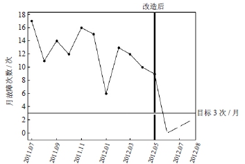 摘 要:通过对高炉本体冷却水流量计流量显示异常进行深入的研究与分析,找到了造成流量计显示异常的根本原因,在此基础上提出了四点关于流量显示异常的处理方法,并实施了改造。改造后,大幅度提高了流量计的稳定运行能力,有效地保证了对高炉炉身冷却水流量的实时监控。 关键字:高炉本体 冷却水流量计 显示异常 改进措施 4350m3高炉本体冷却水流量计是测量炉身冷却水流量的仪表,如果此流量不能正确显示,炉身就有可能烧红,导致炉壁温度过高。只有保证本流量计冷却水流量达到1352m3/h,才能确保炉壁处于正常生产温度,否则可能引起炉壁温度过高,造成事故的发生,因此此流量计的可靠运行与否,将关系到高炉能否安全生产。 高炉长寿是降低成本、提高生产率的关键因素。影响高炉长寿的因素很多,其中高炉冷却壁冷却水热负荷与水温差是重要因素。要想分析热负荷变化趋势,必须有流量数据,而本体流量计经常发生故障,无法显示流量值。因此,要想提高生产率,必须降低流量计故障次数。 1 计划阶段 1.1 现状分析 本体流量计工作平台的煤气浓度(全文中“煤气浓度”均指“质量分数”)最小为900×10-6,一般情况为1100×10-6~1200×10-6,最高时可达1800×10-6,而实际工作时的安全工作范围是低于160×10-6。如此大的煤气浓度的工作平台使得在处理故障的过程中存在较大的安全隐患。表1是对2011年7月—2012年1月4350m3高炉本体冷却水流量计显示异常情况进行的统计。 表1 2011年7月—2012年1月4350m3高炉 本体冷却水流量计显示异常情况统计 次 经过统计分析,得出结论:4350m3高炉本体冷却水流量计在2011年7月—2012年1月平均故障频率为13次/月,故障次数太高,无法满足正常生产要求,因此急需要马上降低故障次数。 1.2 目标设定及可行性研究 1)以2011年7月—2012年1月本体流量计平均故障频率13次/月为基线,以业界标杆1次/月为参照,本次项目目标定为3次/月,提高83.3%,符合项目目标70%~90%的提高原则,计划 2012年7月底实现目标。经分析,目标具有可行性。 2)通过对太钢与宝钢2011年7月—2012年1月高炉本体冷却水流量计平均故障次数的比较,太钢的月平均故障次数明显大于宝钢。由于宝钢与太钢4350m3高炉生产能力是完全相同的,可是宝钢是业界标杆企业,因此,目标具有挑战性。 1.3 原因分析研究 通过头脑风暴法对流量计显示异常原因进行查找,绘制系统图(见图1)来进行原因分析。 图1 原因分析系统图 对系统图分3个层次进行原因分析,共得到10个末端原因,并对其进行逐条确认,找出造成流量计流量显示异常的主要原因。这10个末端原因具体为:一是环境温度太高;二是显示变送器元器件老化;三是显示变送器性能不稳定;四是传感器安装方式不当;五是循环水中有悬浮物;六是测量管内、外温差大;七是水流速度快,气泡多;八是水位流量不稳定;九是传感器类型选择不当;十是测点选择不合理。对以上10个末端原因进行分析确认之后,最终得出“显示变送器性能不稳定”;“传感器安装方式不当”;“传感器类型选择不当”;“测点选择不合理”是关键原因。小组对这4条关键原因进行更深层次的分析研究,找出具体改进措施,其余6项原因属于非要因,到现场进行验证确认,都满足工艺要求,因此,不再做进一步分析。 1.4 根本原因确认 1)运维一组每天都要记录当天的温度与对应的故障次数,小组统计了从2012年2月20日—2012年3月20日的测定结果,发现在30个结果中,环境温度都在10~12℃之间,工艺要求环境温度低于40℃,因此,环境温度都满足工艺要求,所以环境温度太高不是主要原因。 2)运维一组在2012年2月14日休风时,根据产品说明书对使用时间将超过保质期的元器件进行了更换。因此元器件老化也不是主要原因。 3)工艺要求显示变送器在温度低于40℃、现场振动不大的情况下可以连续运行32个月,但是现在频繁死机,只能采取拉闸断电后1min,再合闸送电这种治标不治本的方式,因此显示变送器性能不稳定是主要原因。 4)工艺要求一般情况下使用V法,测量准确,但是可测管径(DN)范围为15~400mm,而现场实际管径是630mm,因此传感器安装方式不当是主要原因。 5)小组在循环水箱上安装了过滤装置、温控仪、流速控制仪,并使其满足工艺要求,因此有悬浮物、温差大、水流快、水位流量不稳定不是主要原因。 6)两管壁之间距离太近,无法取出传感器进行传感器的清洗,不符合工艺要求,因此传感器类型的选择不当是主要原因。 7)显示变送器与传感器之间信号传送距离太长,有电磁干扰,不符合工艺要求,因此,测点选择不合理是主要原因。 对以上原因进行现场确认以后,筛选出导致故障次数高的四条根本原因,分别是:显示变送器性能不稳定;传感器安装方式不当;传感器类型选择不当;测点选择不合理。 2 执行阶段 2.1 制定措施 针对造成本体流量计故障次数高的四条主要原因,一一制定对策。 1)经现场实际应用2个月的时间,MTPCL-5G显示变送器性能更稳定,将原来型号为Alphasonic的显示变送器更换为MTPCL-5G型显示变送器。 2)传感器的安装方式共有四种,分别是V法、Z法、N法、W法。V法、Z法较常用,N法、W法不常用。当管道很粗、液体中存在悬浮物、管内壁结垢太厚时,V法安装信号弱,机器不能正常工作;而Z法由于其安装原理是超声波在管道中直接传输,没有反射,即单声程,信号衰耗小,所以选用Z法。 3)清理干净管道安装区